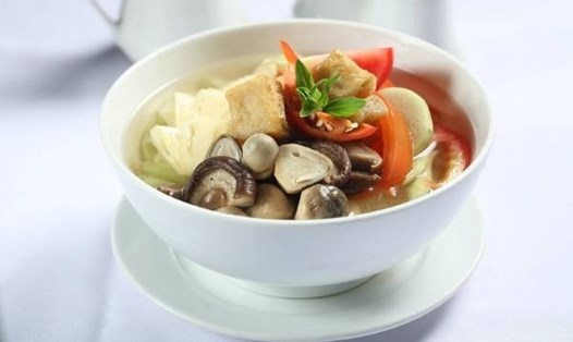 Khi dùng, bạn dọn lẩu với các loại rau xanh và mì chay hoặc bún.
